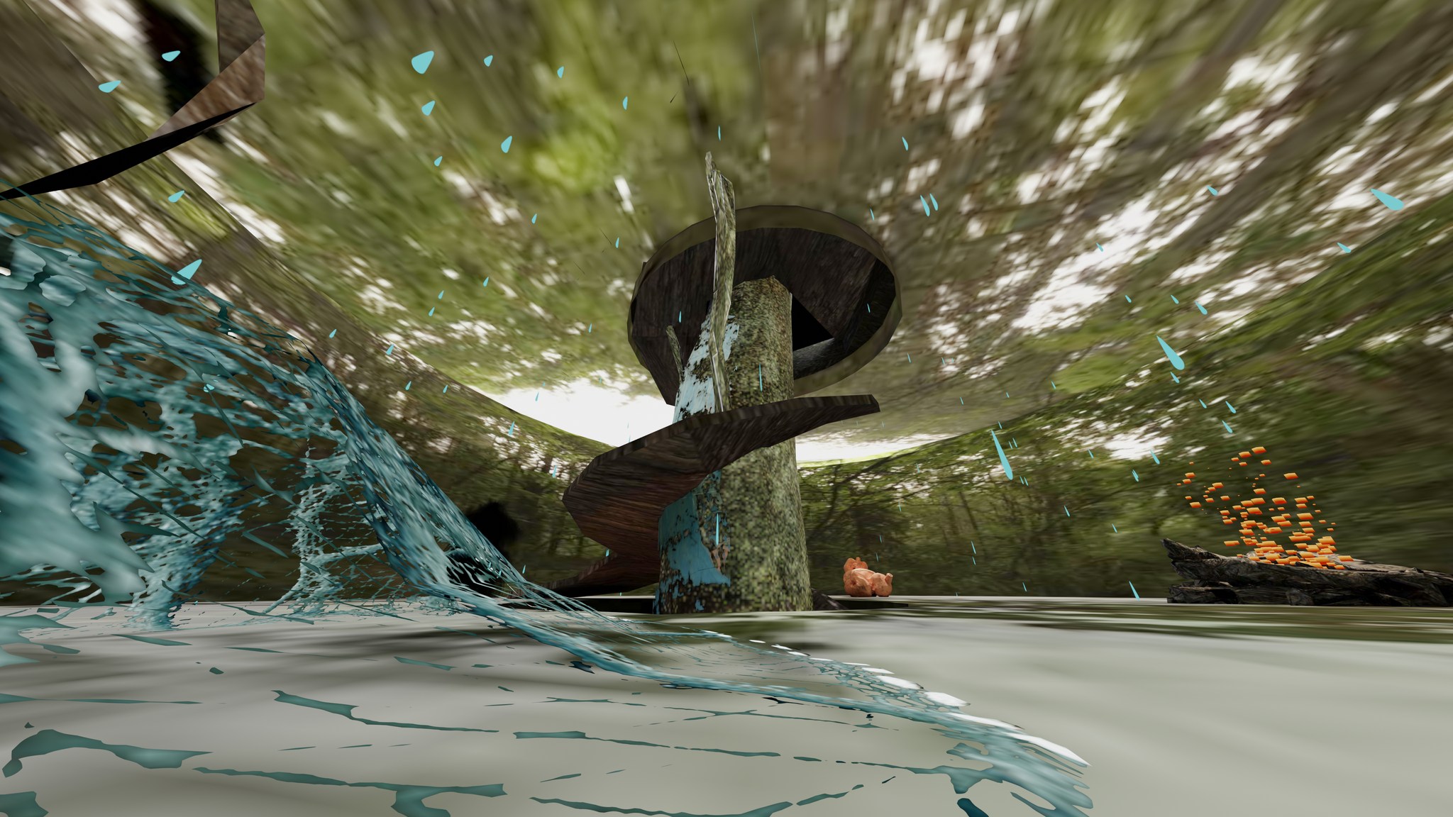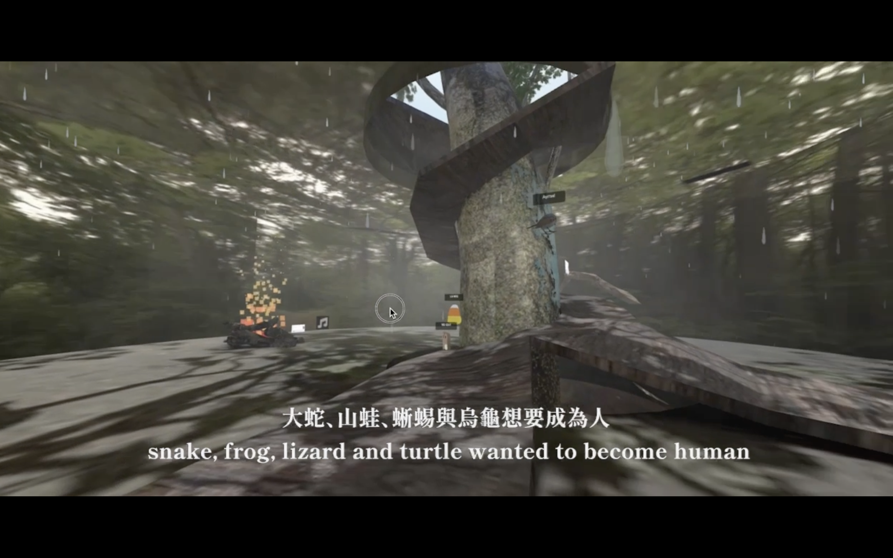 Humus: Mythical Route is the parallel online exhibition zone of Humus, which displays the experience of curators, the artists and the tribal community members climbing Cilangasan through virtualizing the sounds, bodily sensations and space from the process of the field study. The online exhibition also showcases several works developed by artists over the past three years. The online exhibition zone is spatially structured as an abstract Cilangasan, with an enormous tree of life that goes through the three internal stories of the sacred mountain, serving as the stairs to climb the mountain and the route to revisit the myth. The first story is the soil, which serves as the foundation of the exhibition, and showcases some of the works from the past corresponding exhibition in 2020. At the same time, soil is also the origin of myth, hinting at the sticky, inseparable relationship between human and clay. When moving upward and departing from the land, human, snake, frog, lizard, and turtle are differentiated, and further “become human,” as it is described in the myth. The second story is the woods, which extends some of the works showcased in the physical exhibition, symbolizing the natural elements and situations in the process of climbing the sacred mountain. Finally, the space on the third story serves as the end of the mythical mountain route, and re- interprets the origin revealed by the stele. Through the virtual body, the audience emerge from the muddy soil in the darkness, listen to the myth in the woods amidst the rain, and eventually arrive at the end of the myth and the starting point of the tribal history in singing. When the singing stops, they seem to follow the myth towards a different distance.