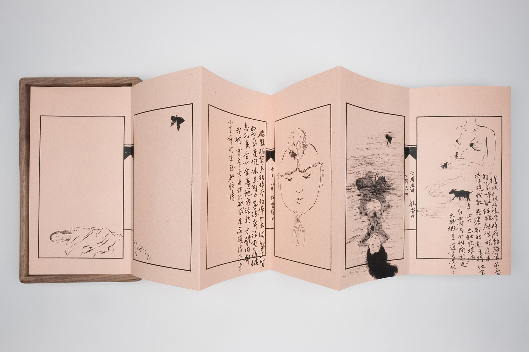“After becoming a mother, am I still me ?” Pregnancy is like alchemy; with each “day” leaning towards the result of an alchemy, each entirely mysterious, mundane, yet changing everyday. This ancient book format is often used for copying scriptures or depicting mythological stories, “Pregnancy of Ancient books”, allows the implicit metaphor of old books being pregnant, to express the uniqueness of pregnancy as a theme in ancient books.