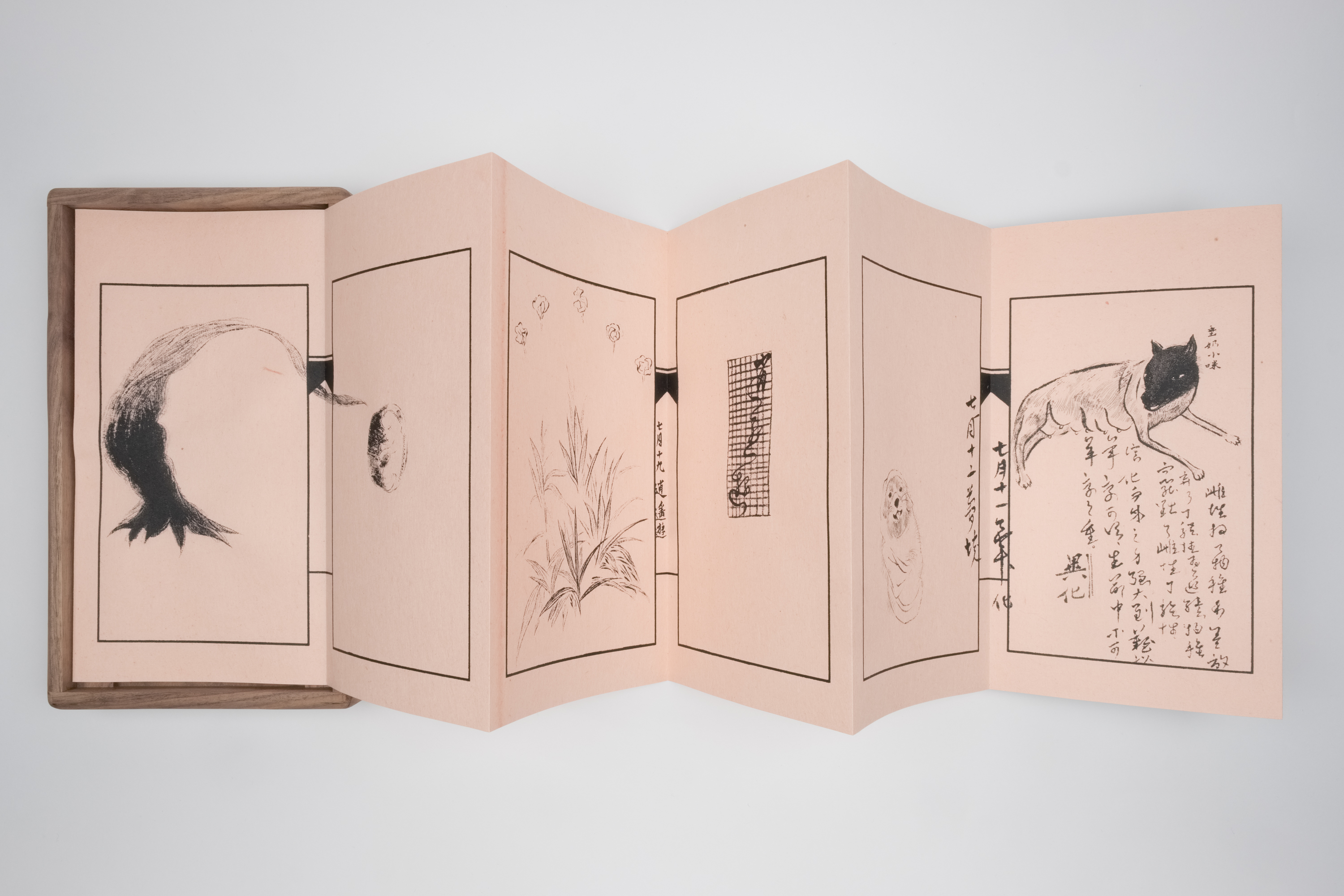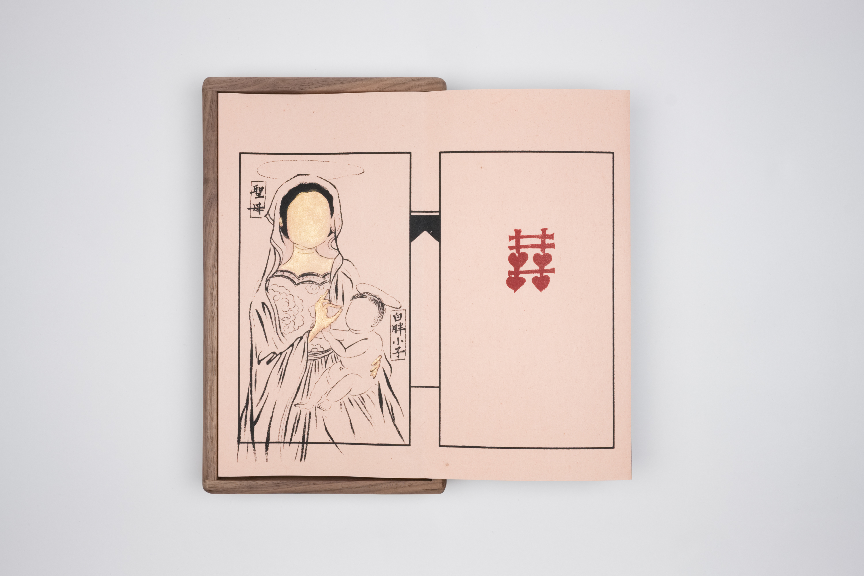 褚皮紙、墨、絹印、胡桃木盒