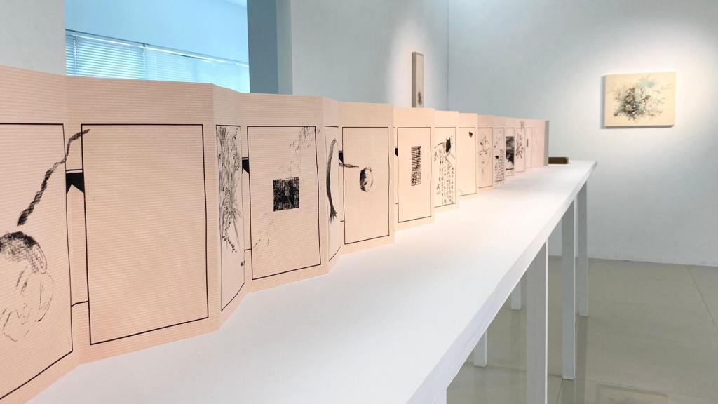 當書寫下身體的變化,沾上墨的毛筆也隨著身體的呼吸和握筆的方式,在紙上留下了隨筆的文字與圖像,書寫彷彿為我延長了身體的空間,在這個空間中,散落著濕潤的字跡和保有呼吸的行距,將懷孕的那十個月,因為孕婦身體的限制而造就的書寫,逐漸累積成可以被看見的時間 。