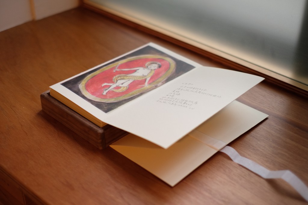 Through the ancient concepts conveyed in the cards, this Tarot chapter seeks to respond to the themes developed in the Alchemy chapter, such as the changes happening to a pregnant body. The Tarot cards are closely related to life, with their figures predominantly featuring goddesses, and Tarot serving as a medium to predict destiny. In this volume, I started with colored pencils drawings, drawings blending Chinese and Western cultures, then printed and bound them into an album. Adapting the images was also a way for me to transform the language of Tarot into my own, with for example, the “World” card combined with the totems of Fuxi and Nüwa, as well as the Earth Goddess; or the “Empress”, based on the image of Medusa’s severed head, adorned with a halo symbolizing her crown.